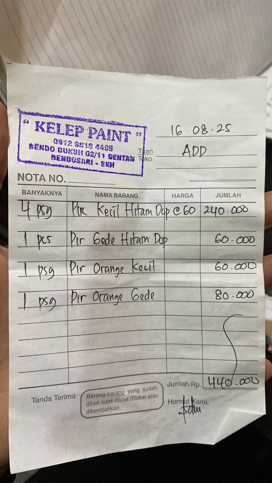 | 1 | 21-08-2025 06:30 | PELUNASAN | Rp. 440,000 | Rp. 0 | Rp. 440,000 | . | Download |