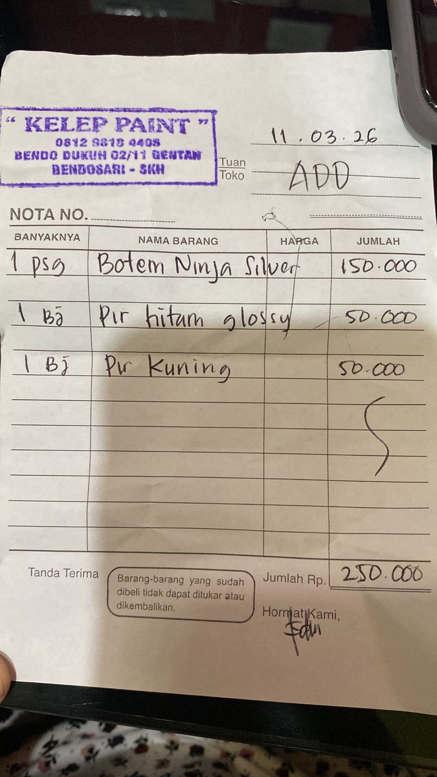 | 1 | 11-03-2026 06:30 | PELUNASAN | Rp. 250,000 | Rp. 0 | Rp. 250,000 | . | Download |